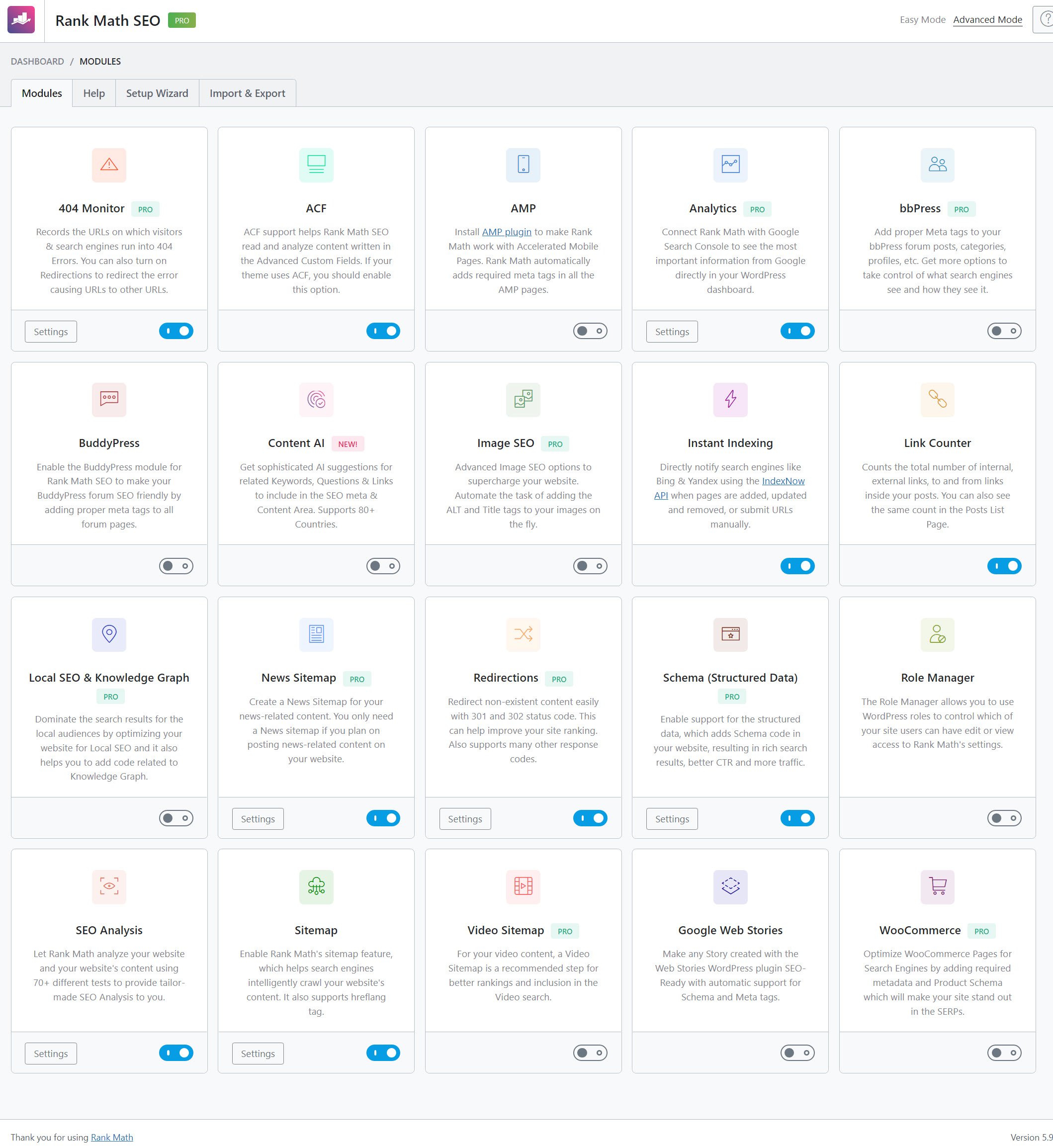 Several modules in the Rank Math SEO plugin are not active at installation (e.g., the schema, image optimization, and redirects modules), but they can be enabled when required.