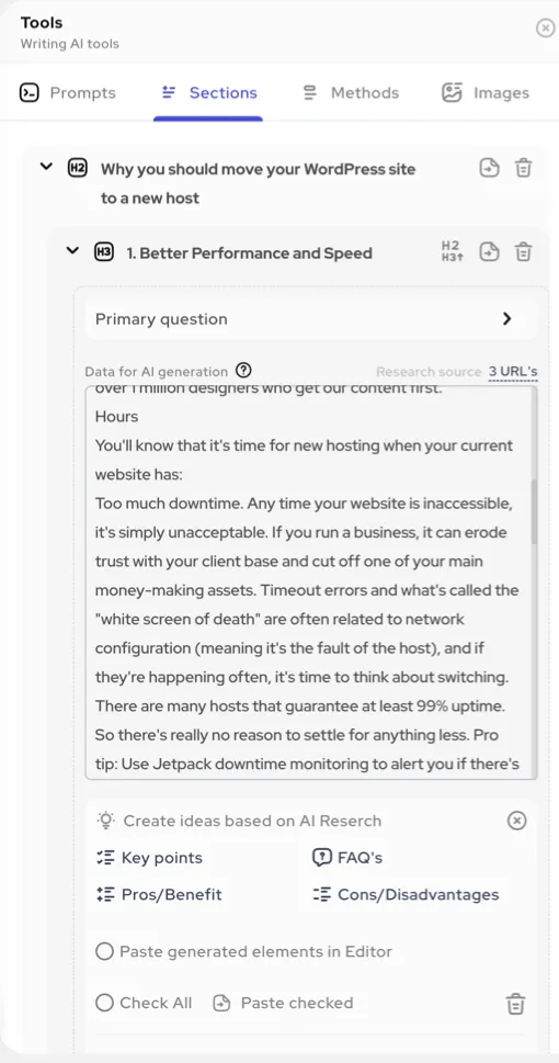 Outranking’s AI is connected to the internet and only writes the prompt after doing background research and finding facts and information, scouting 100s of pages before writing the instructions..