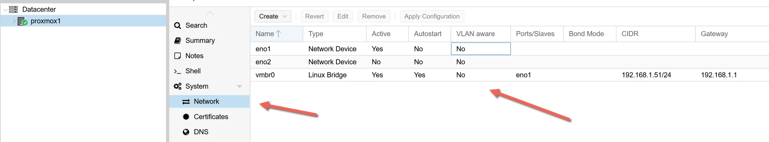 If you want, you can go to the command line (shell) in the Proxmox WebGui or use Putty to check the configuration of the nic before you click ‘VLAN aware”